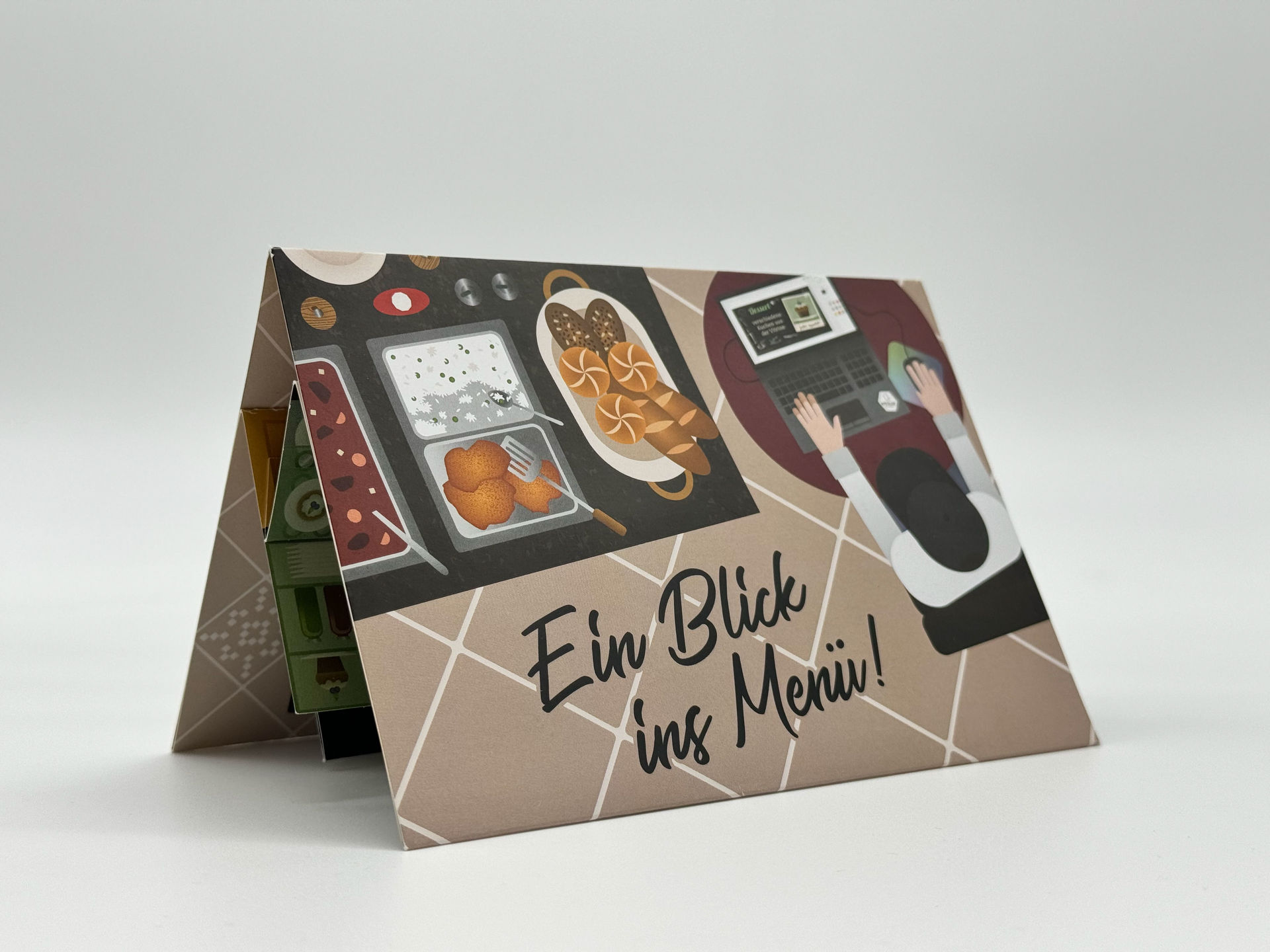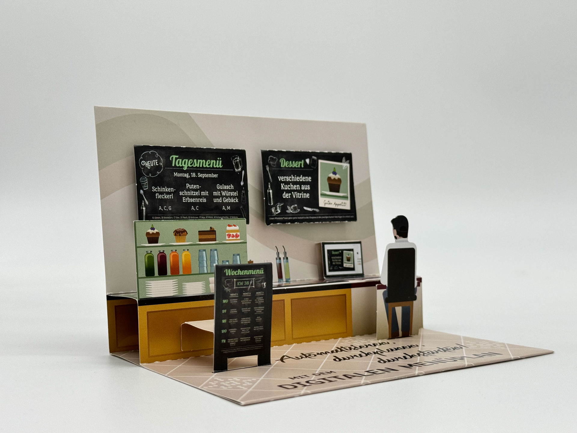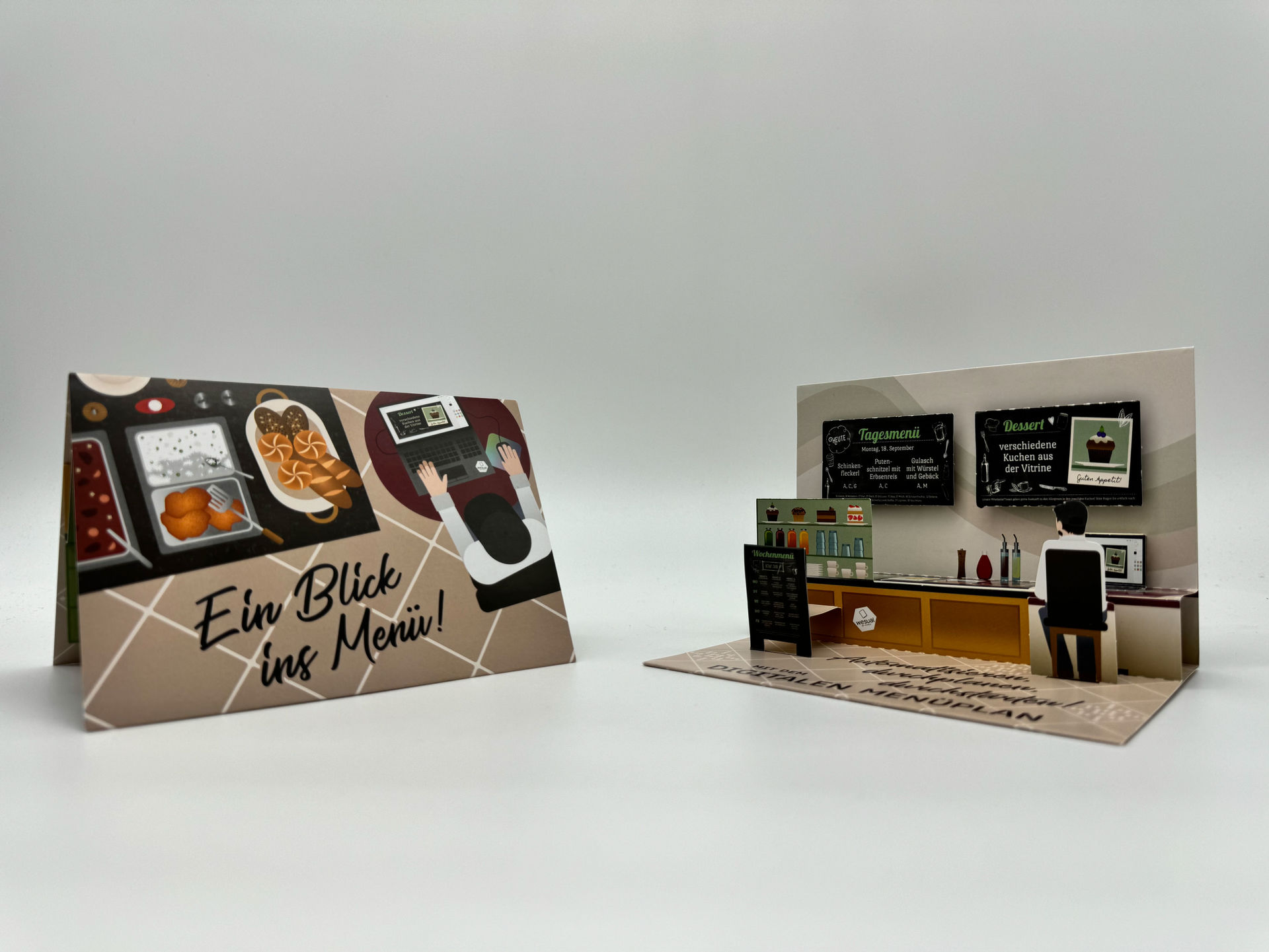 Die Pop-up Karten stecken voller Liebe zum Detail. Ob das Grafikprogramm, das man am Laptop erkennen kann, oder der Menüplan mit köstlich klingenden Speisen - es wurde auf alles geachtet.